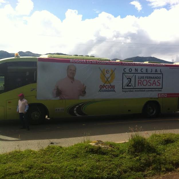 Por Carlos Villota Santacruz.- Quien fuera uno de los mejores funcionarios de la saliente administración del alcalde Gustavo Petro, el ex Director del IDT, Luis Fernando Rosas, recorrió en su sede itinerante –un bus acondicionado para ocupar una curul en el Concejo por el Partido Opción Ciudadana No 2- su campaña el pasado 17 de octubre, en la localidad de Chapinero, luego de visitar Usme, Bosa, Kennedy, Usaquén, Teusaquillo, Engativá y santa fe entre otros.